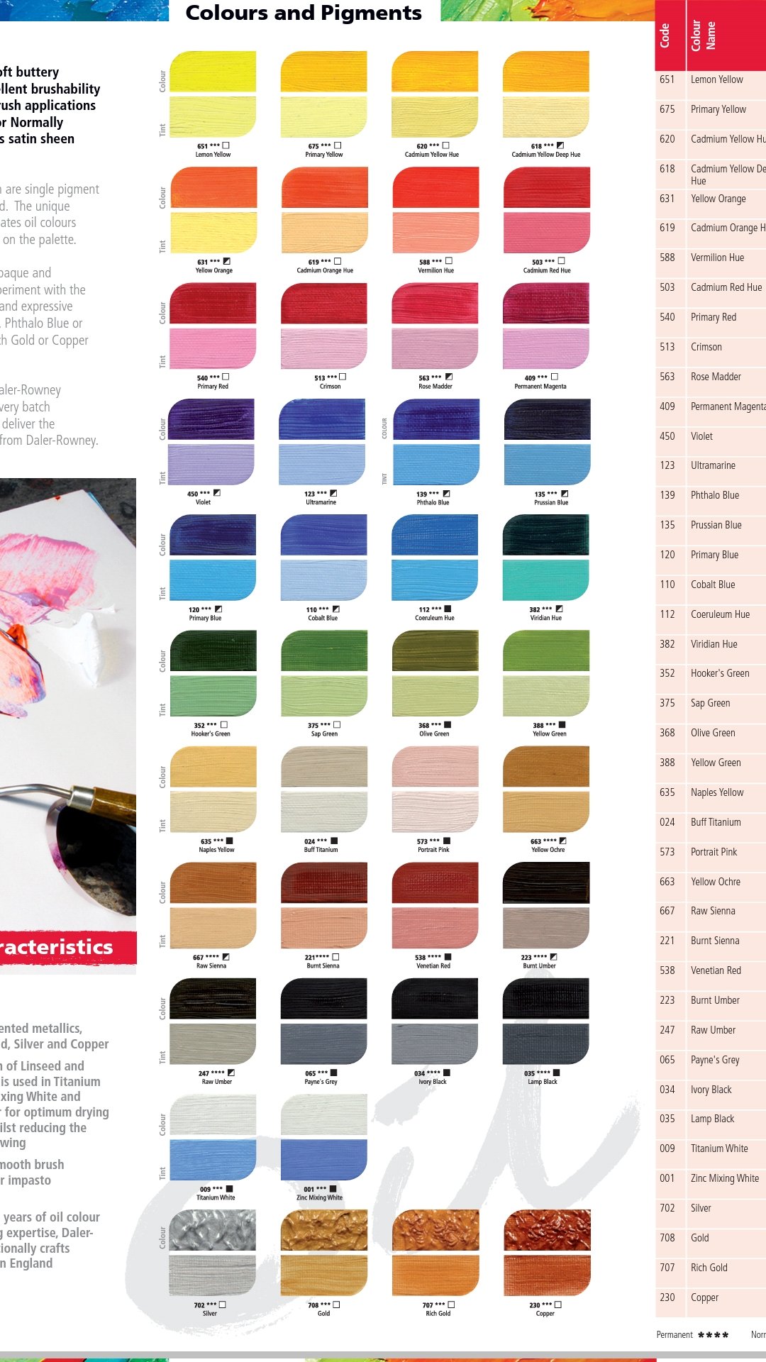 CADMIUM ORANGE HUE ,Hookers Green ,Payne s Grey ,Portrait Pink ,Raw Umber ,Sap Green ,Buff Titanium ,Cadium Yellow Deep Hue ,Cadium Yellow Hue ,Cobalt Blue ,Coeruleum Hue ,Copper ,Ivory Black ,Naples Yellow ,Olive Green ,Permanent Magenta ,Phthalo Blue ,Primary Blue ,Raw Sienna ,Roose Madder ,Silver ,Venetian Red ,Vermillion Hue ,Viridian Hue ,Yellow Green ,Yellow Orange ,Zinc Mix White |